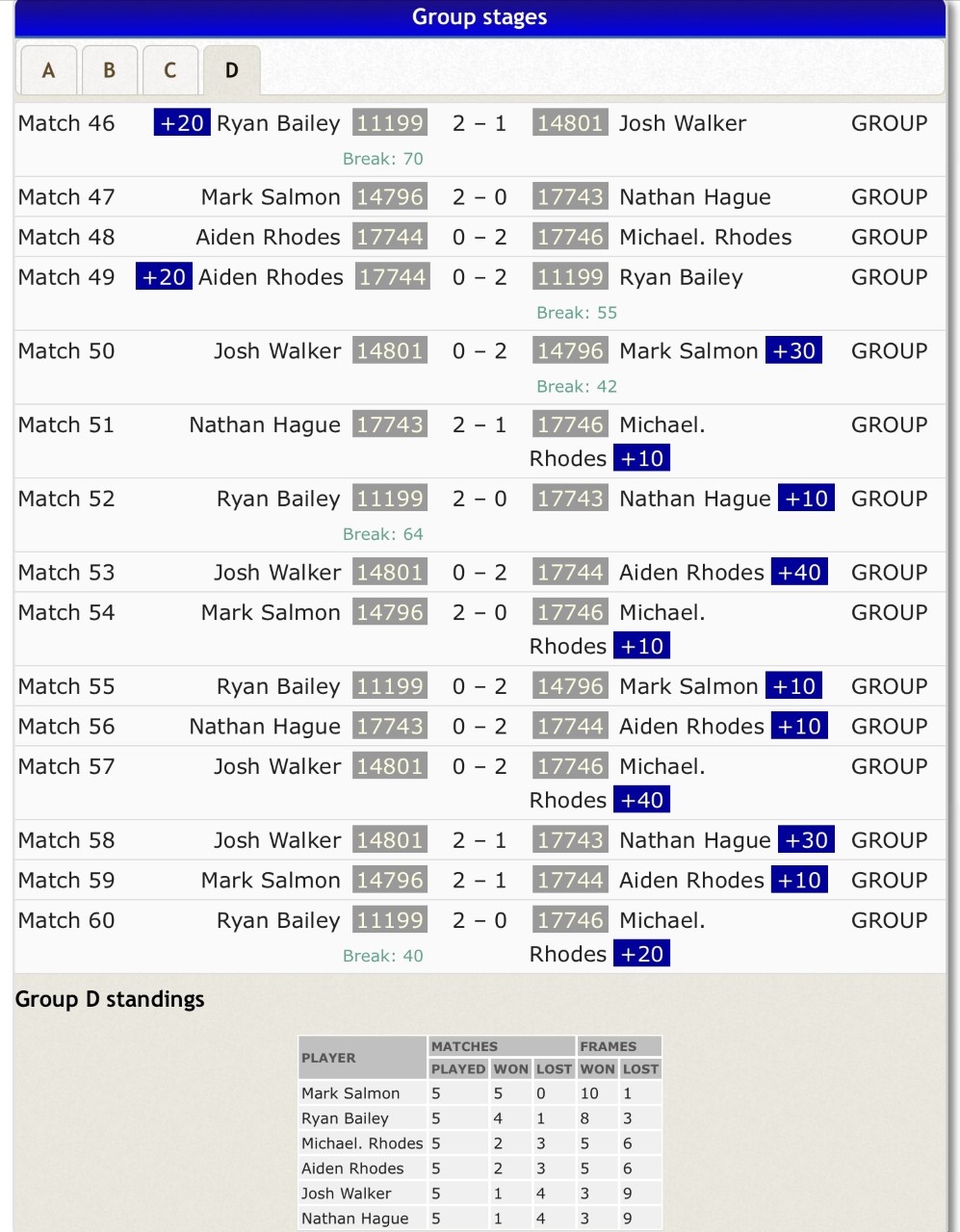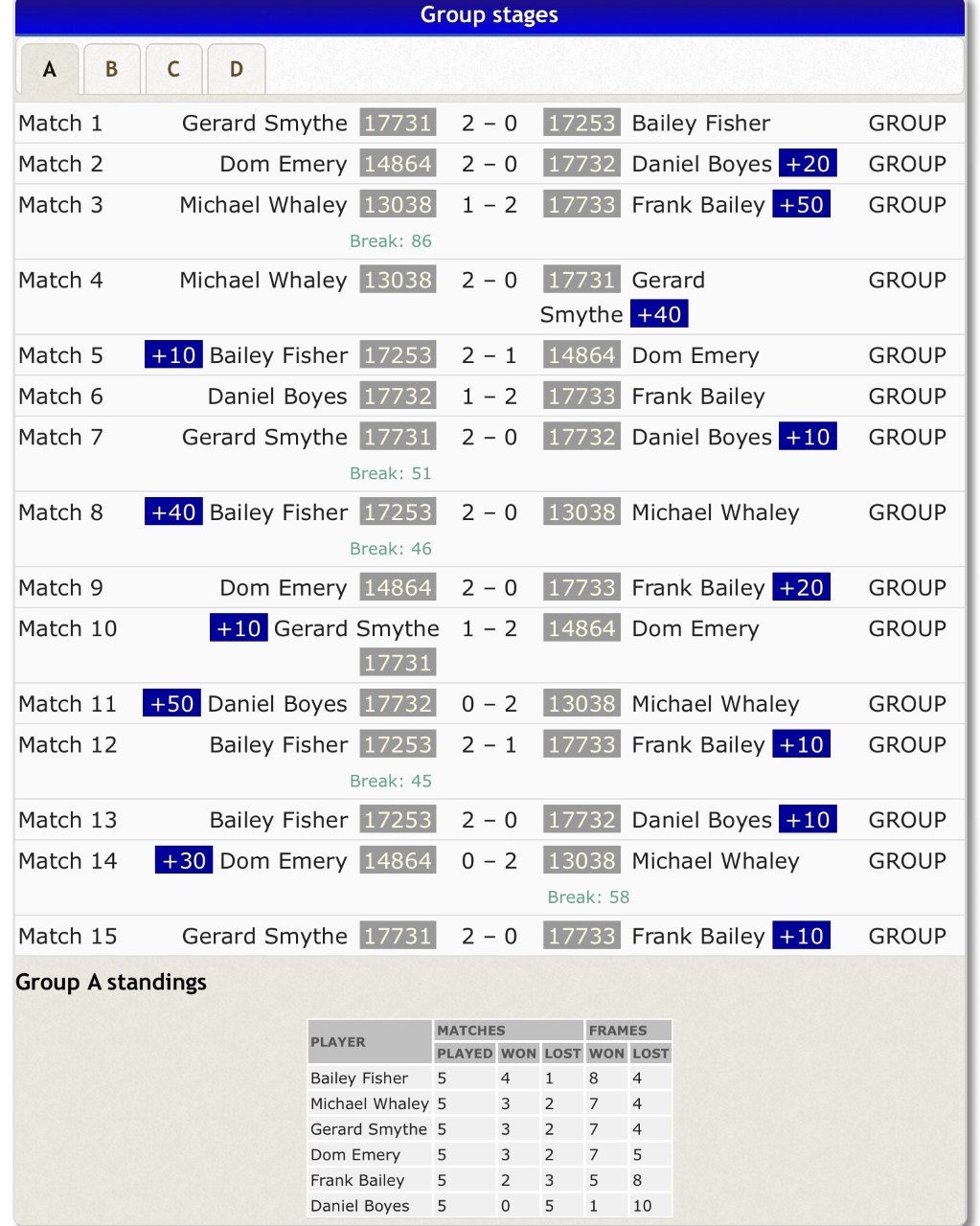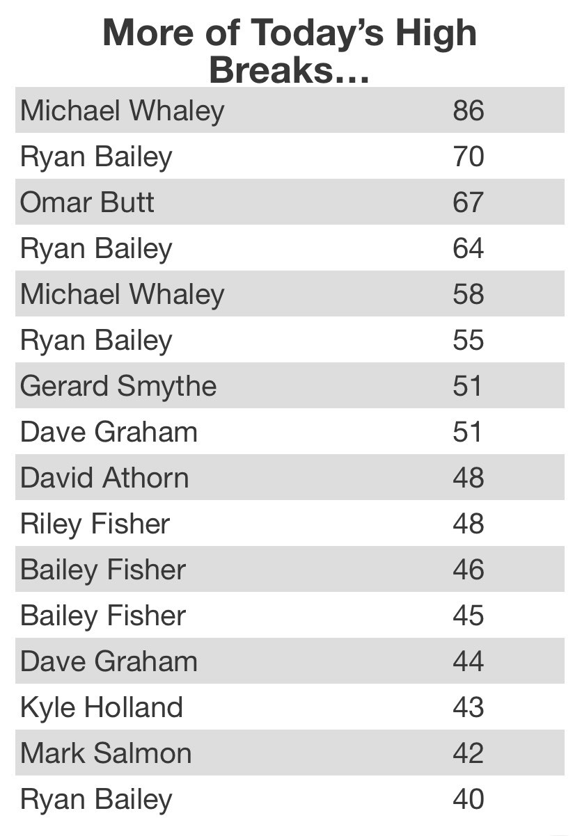 Whaley finished with 3 wins from 5 games and made the day’s highest break of 86 on top of a 58, but ended as second placed behind the impressive young Bailey Fisher, who topped the group with 4 wins and made breaks of 46 and 45.