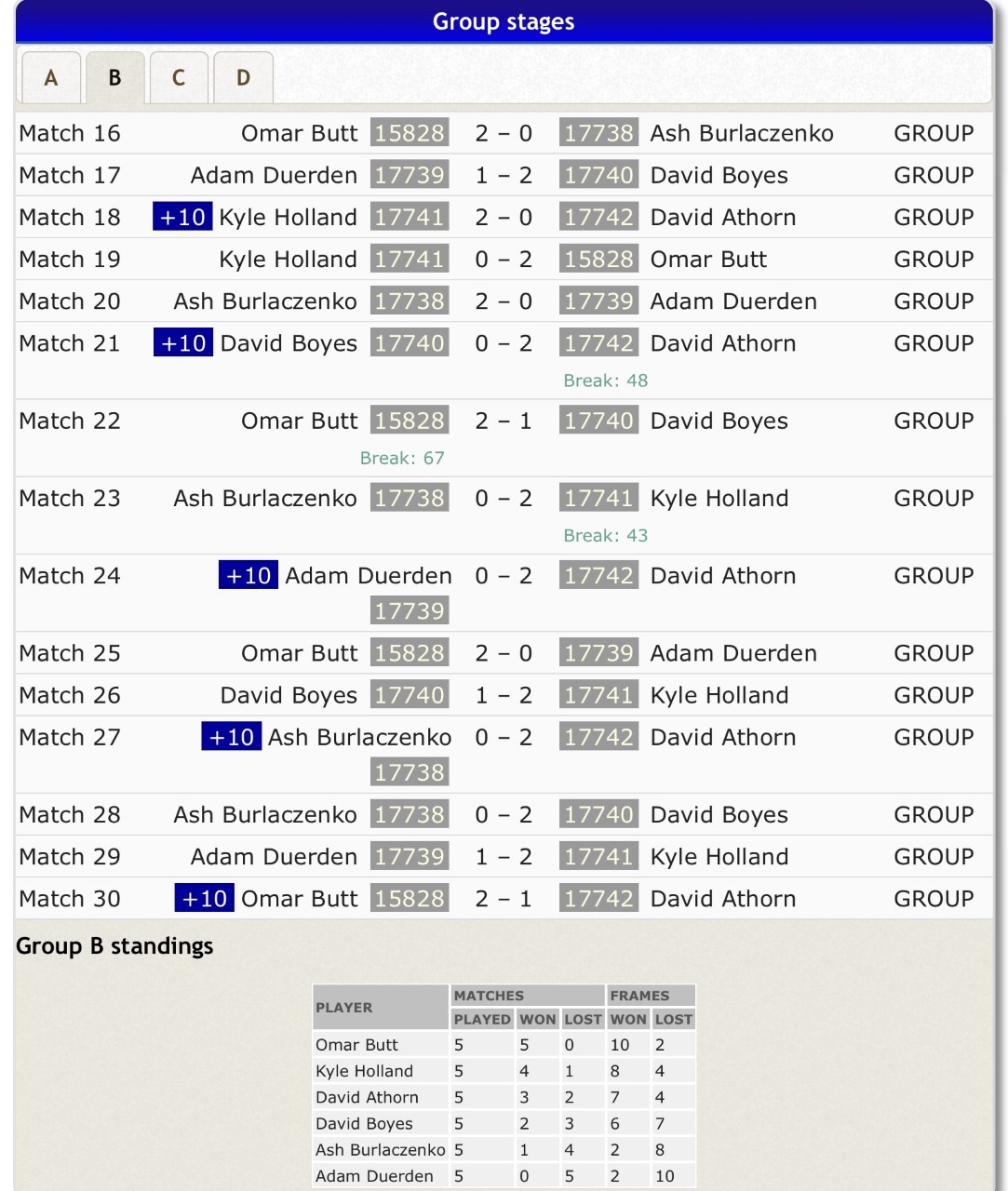 2016 champion Omar Butt, topped Group B and qualified with Kyle Holland, whilst Mark Salmon and Ryan Bailey qualifying to make up the final 16.