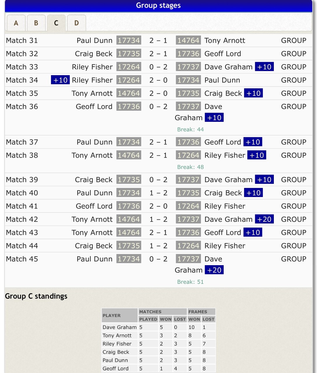 Brother Riley Fisher made a break of 48 during the day but was unable to make it through the group stages, instead this was Dave Graham and Tony Arnott successfully negotiating the round robin stage, with Graham winning all 5 matches.