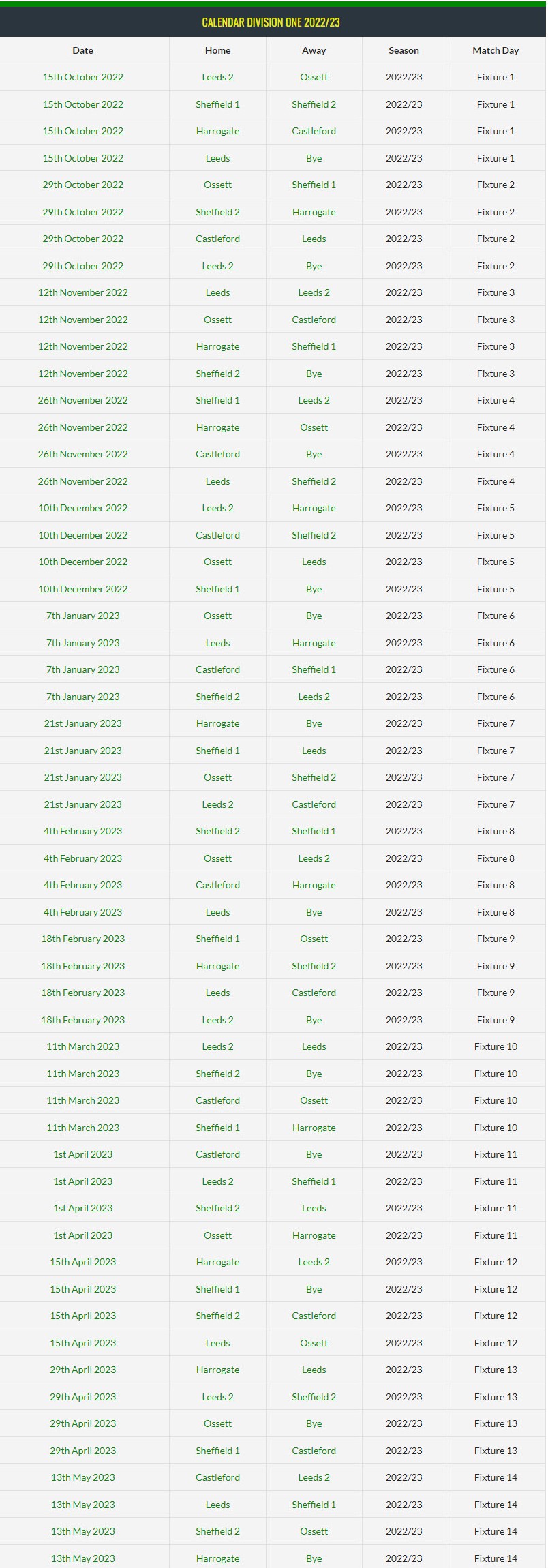 The season starts on the weekend commencing 15th Oct 2022 for Division 1 and 22nd Oct 2022 for Division 2.