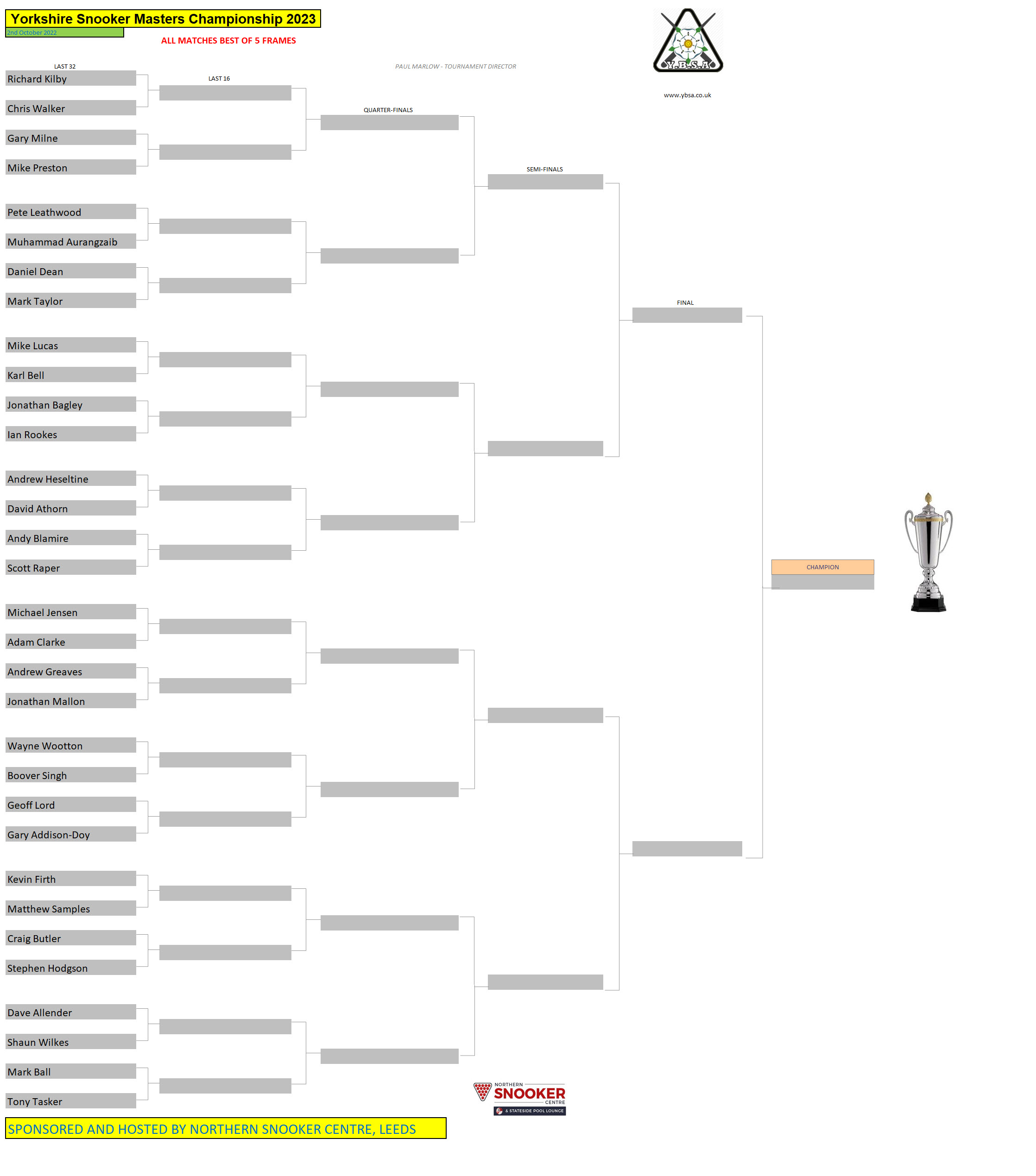 All entry fees will be paid out in prize money and in addition the winner will be presented with a “Yorkshire Masters Annual Trophy”.