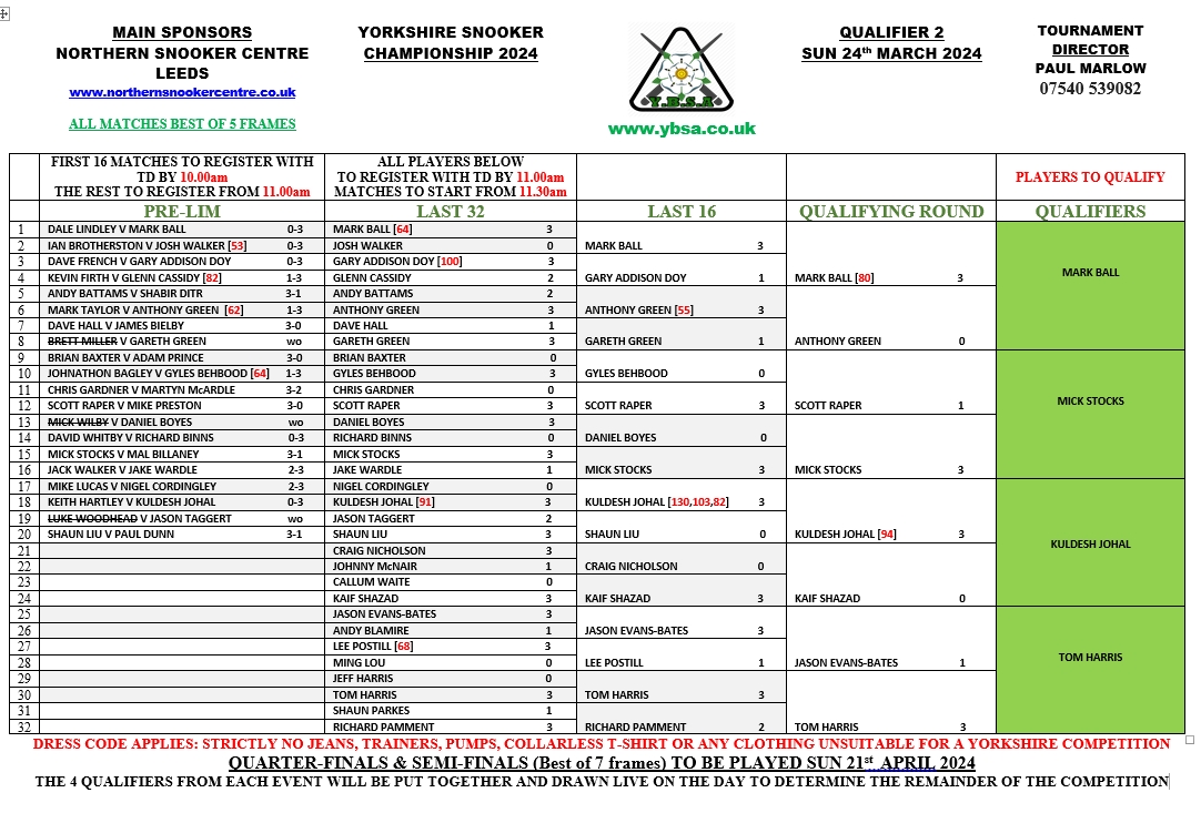 After a long eight and a half hour day of snooker, the quarter-final lineup for this year’s Yorkshire Snooker Championship has been completed.