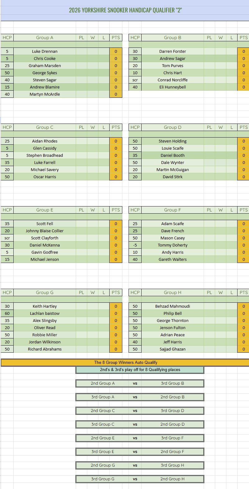 The Yorkshire Snooker Handicap Qualifier “2” Draw