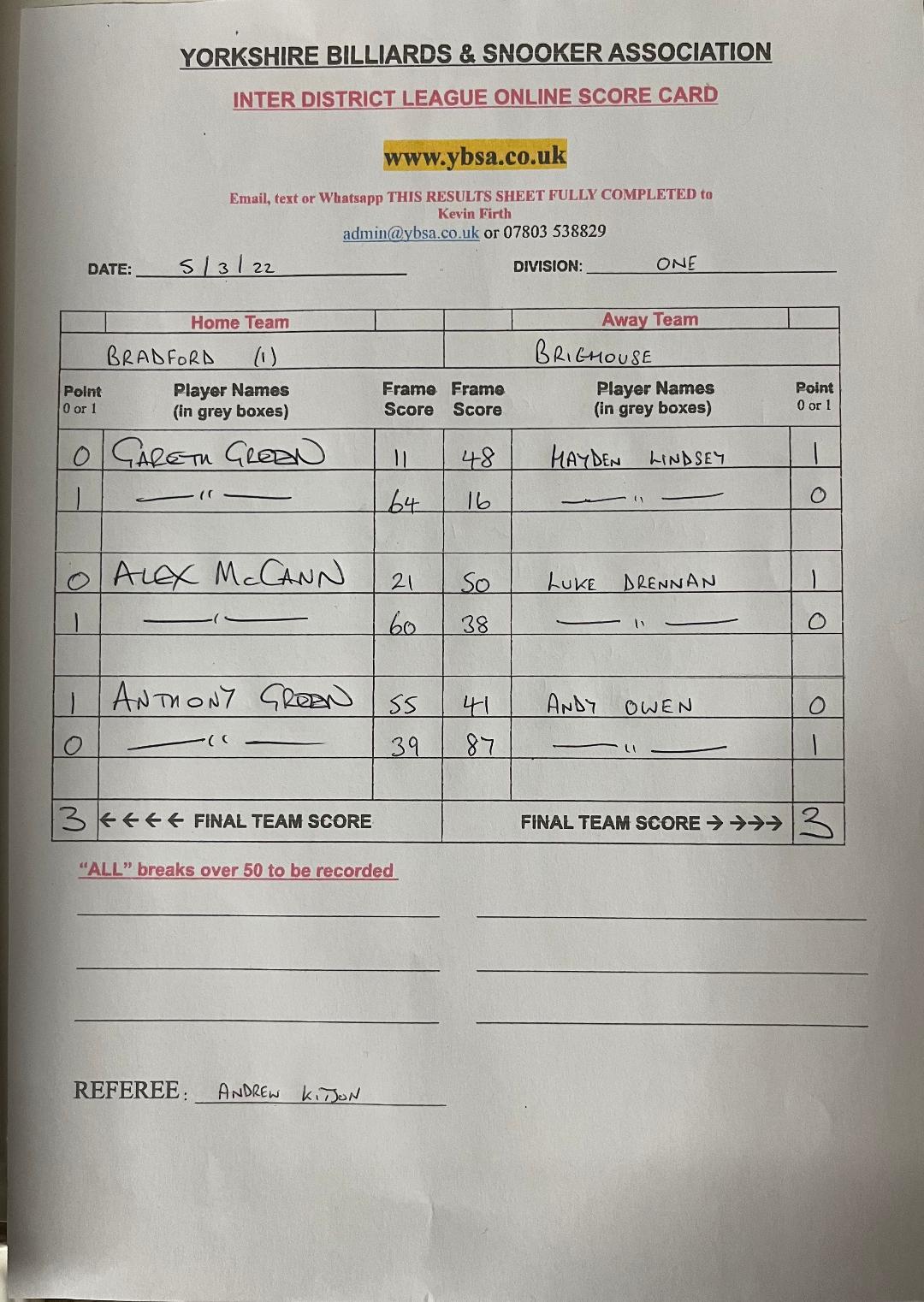 | 5th March 2022 | 7:30 pm | Division One 2021/22 | 2021/22 | Fixture 4 |