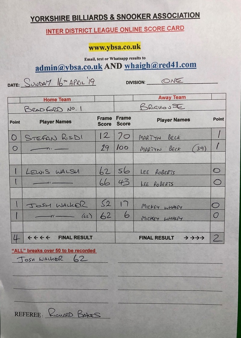 | 13th April 2019 | 7:30 pm | Division One 2018/19 | 2018/19 | Fixture 13 |
