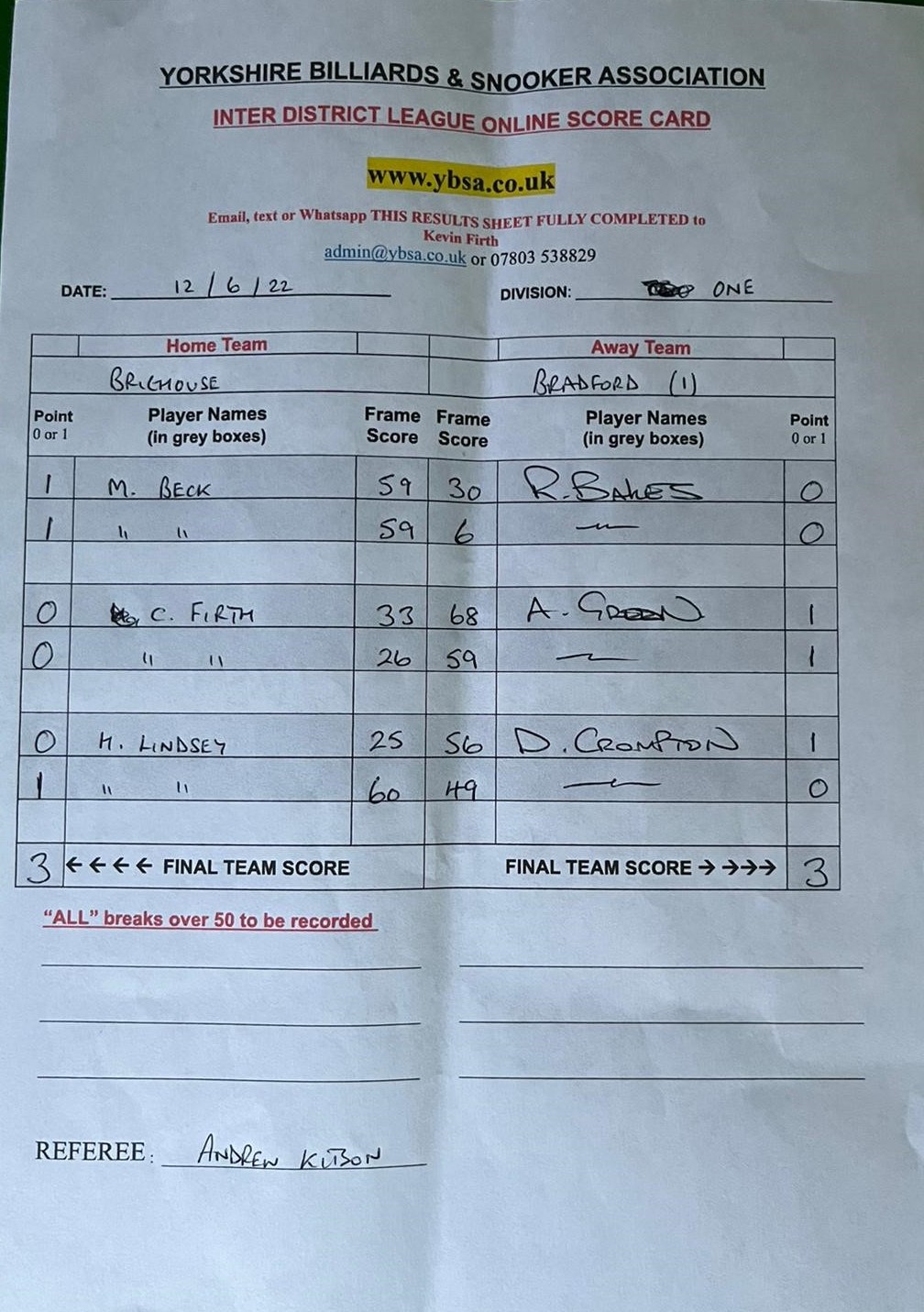 | 11th June 2022 | 7:30 pm | Division One 2021/22 | 2021/22 | Fixture 11 |