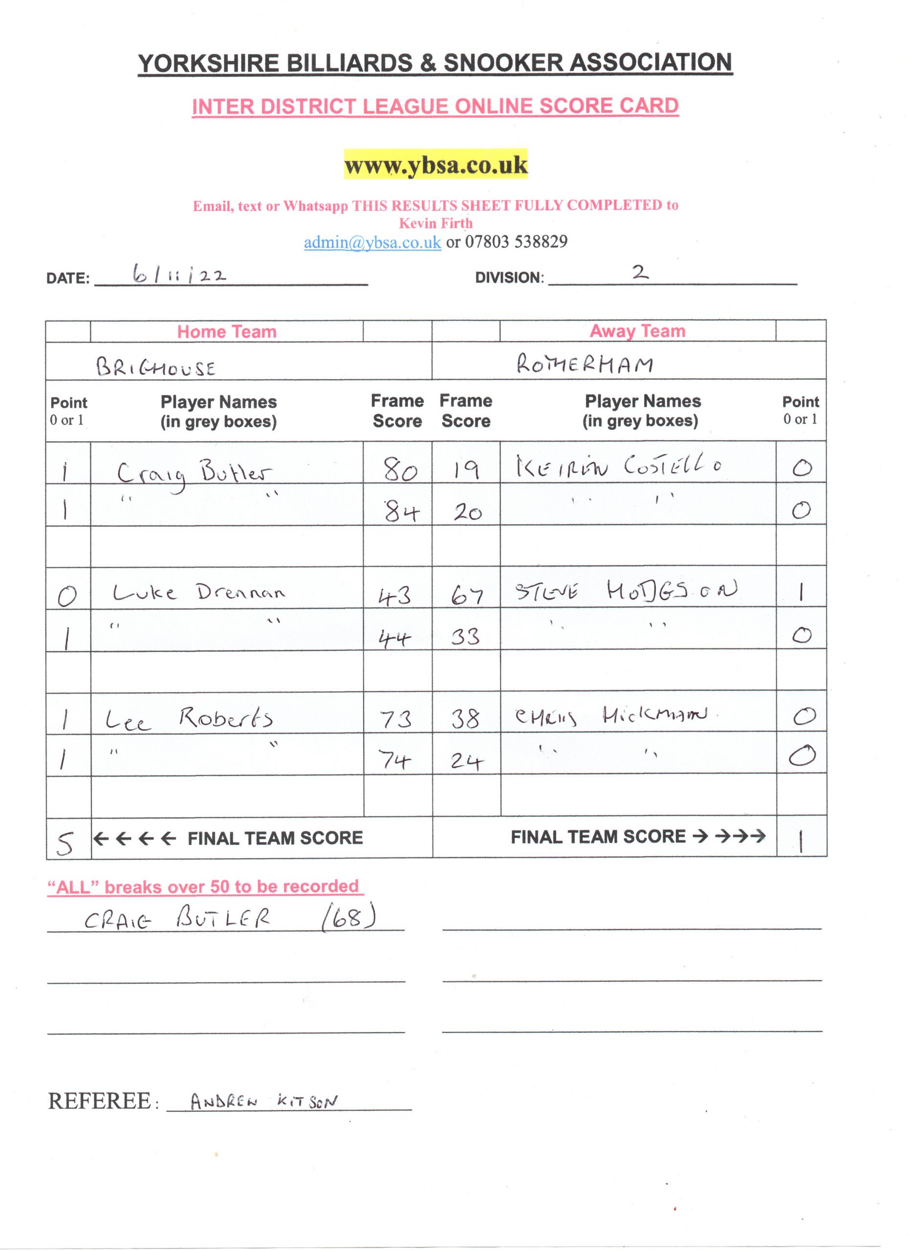 | 5th November 2022 | 7:30 pm | Division Two 2022/23 | 2022/23 | Fixture 2 |