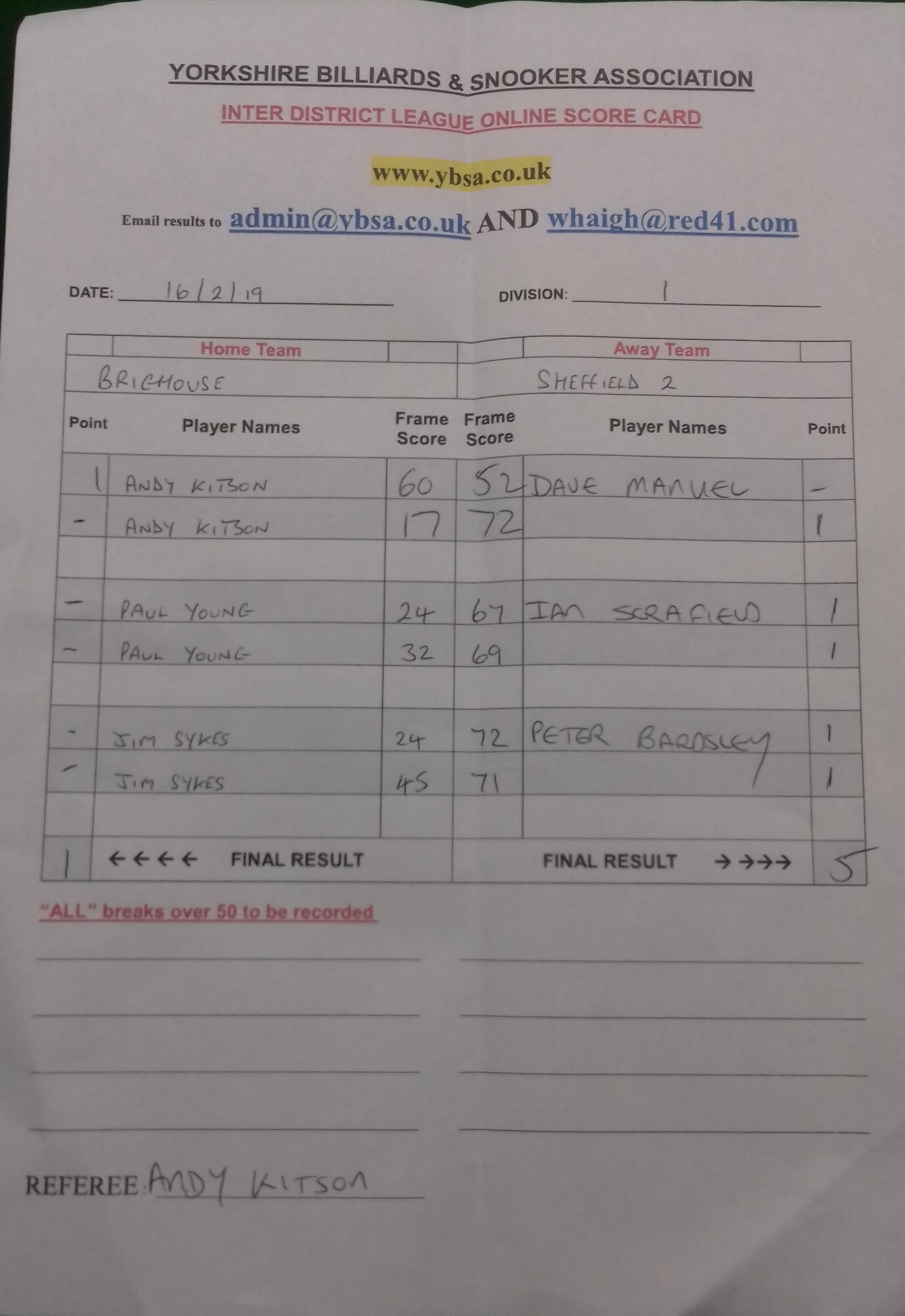 | Sheffield 2 | 4 - 2 | Brighouse |