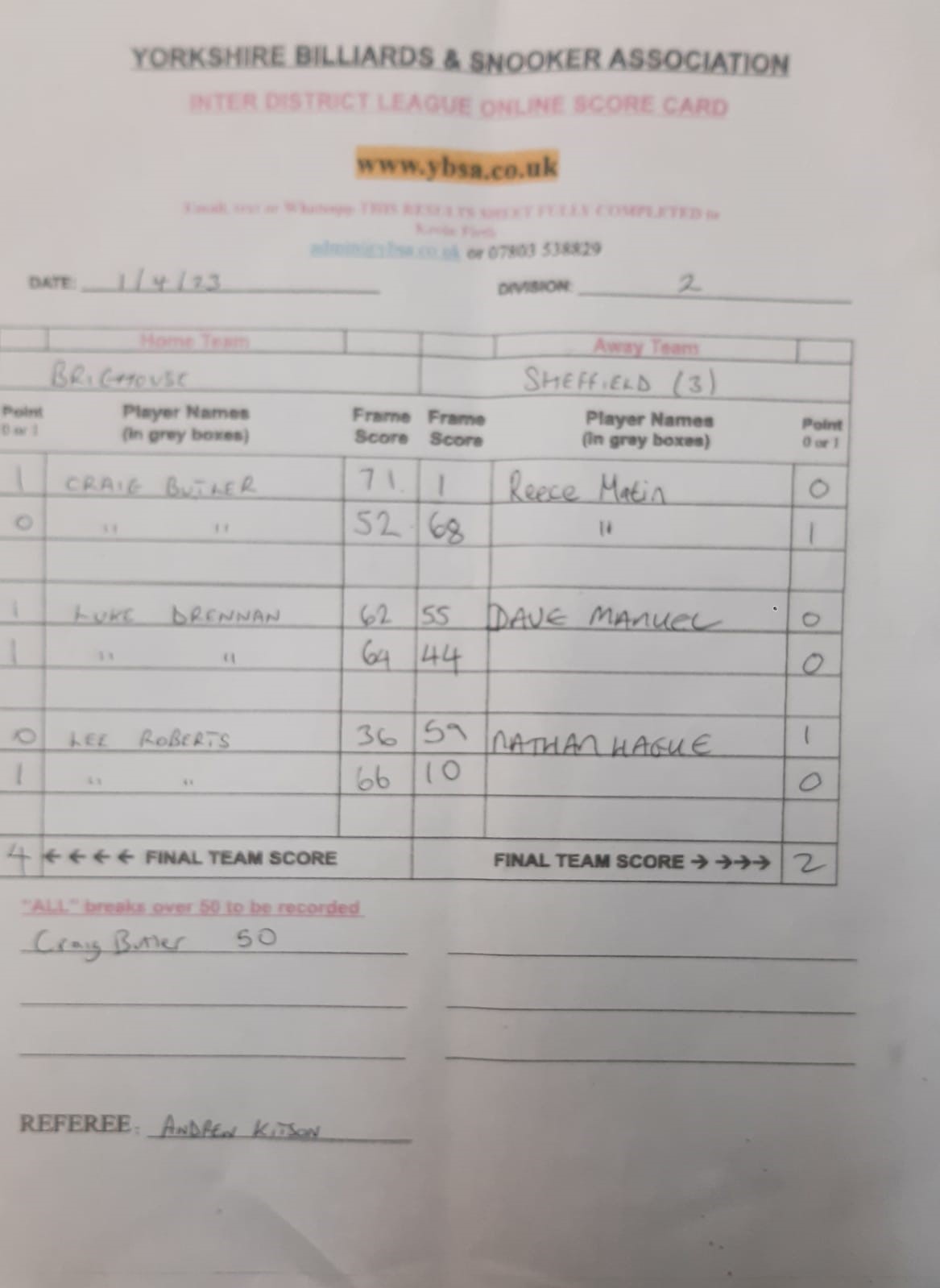 | 15th April 2023 | 7:30 pm | Division Two 2022/23 | 2022/23 | Fixture 10 |