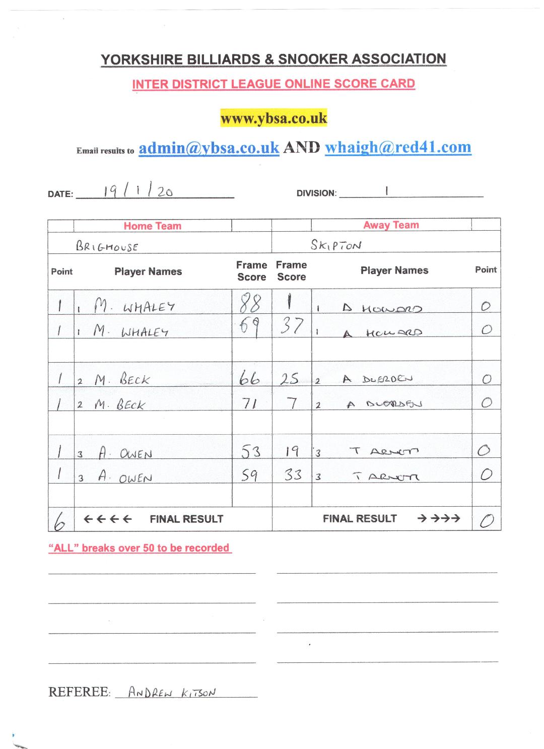 | 18th January 2020 | 7:30 pm | Division One 2019/20 | 2019/20 | Fixture 6 |