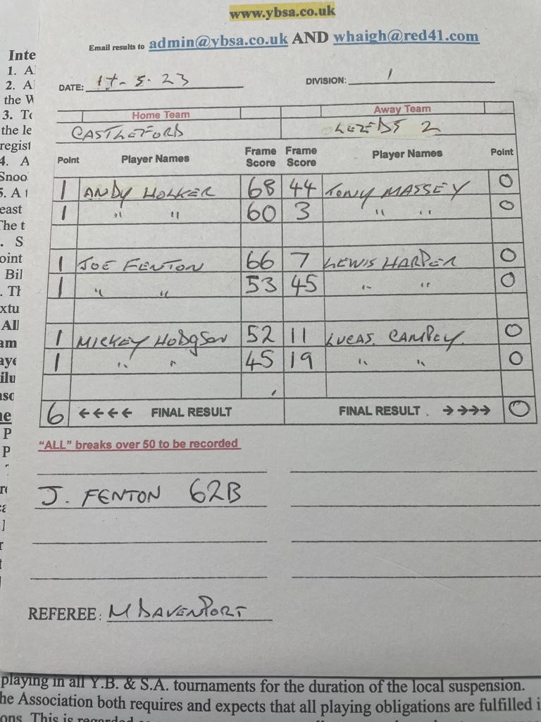 | 13th May 2023 | 7:30 pm | Division One 2022/23 | 2022/23 | Fixture 14 |
