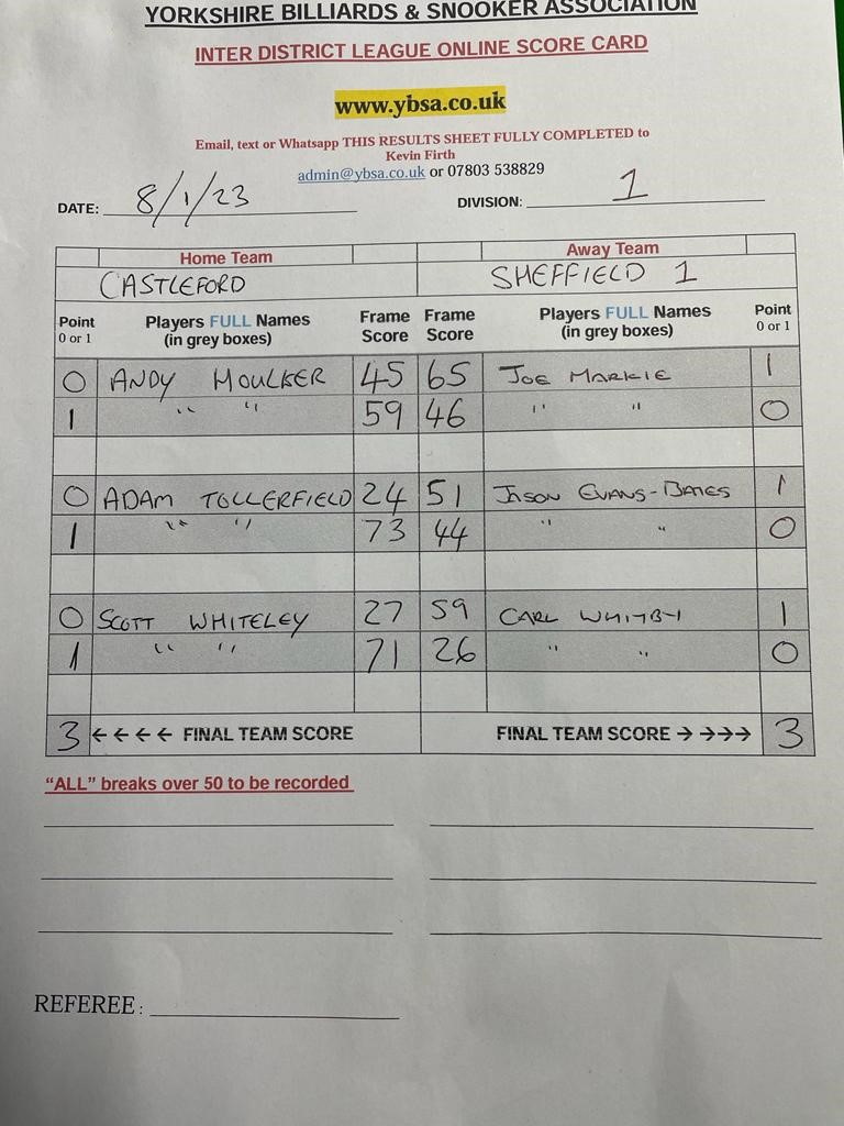 | 7th January 2023 | 7:30 pm | Division One 2022/23 | 2022/23 | Fixture 6 |