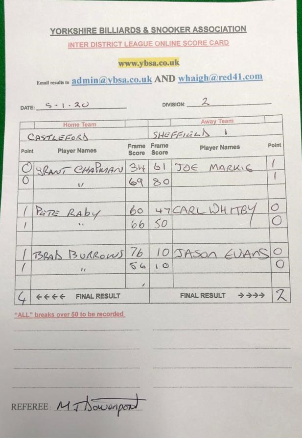 | 4th January 2020 | 7:30 pm | Division Two 2019/20 | 2019/20 | Fixture 5 |