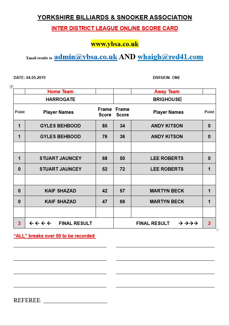 | 4th May 2019 | 7:30 pm | Division One 2018/19 | 2018/19 | Fixture 14 |