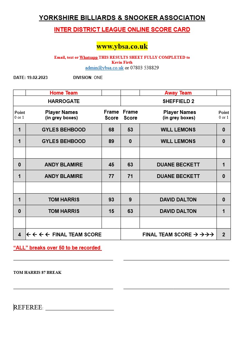 | 18th February 2023 | 7:30 pm | Division One 2022/23 | 2022/23 | Fixture 9 |