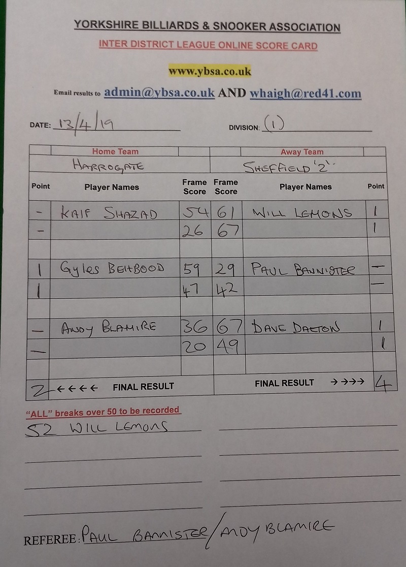 | Sheffield 2 | 5 - 1 | Harrogate |