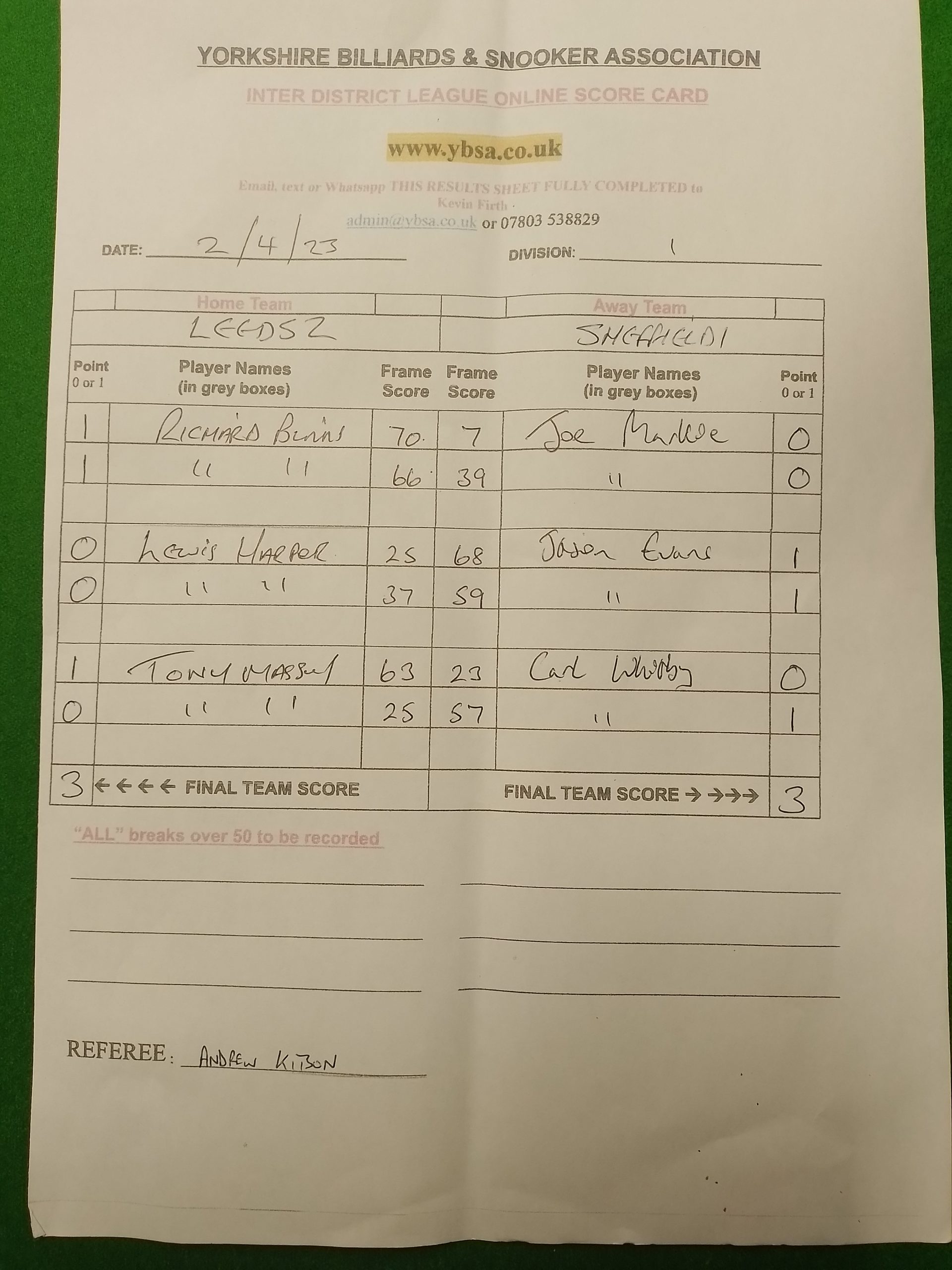 | 1st April 2023 | 7:30 pm | Division One 2022/23 | 2022/23 | Fixture 11 |