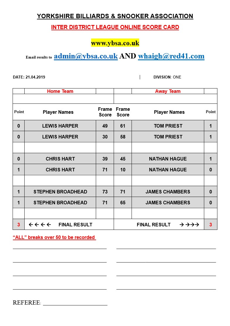 | 13th April 2019 | 7:30 pm | Division One 2018/19 | 2018/19 | Fixture 13 |