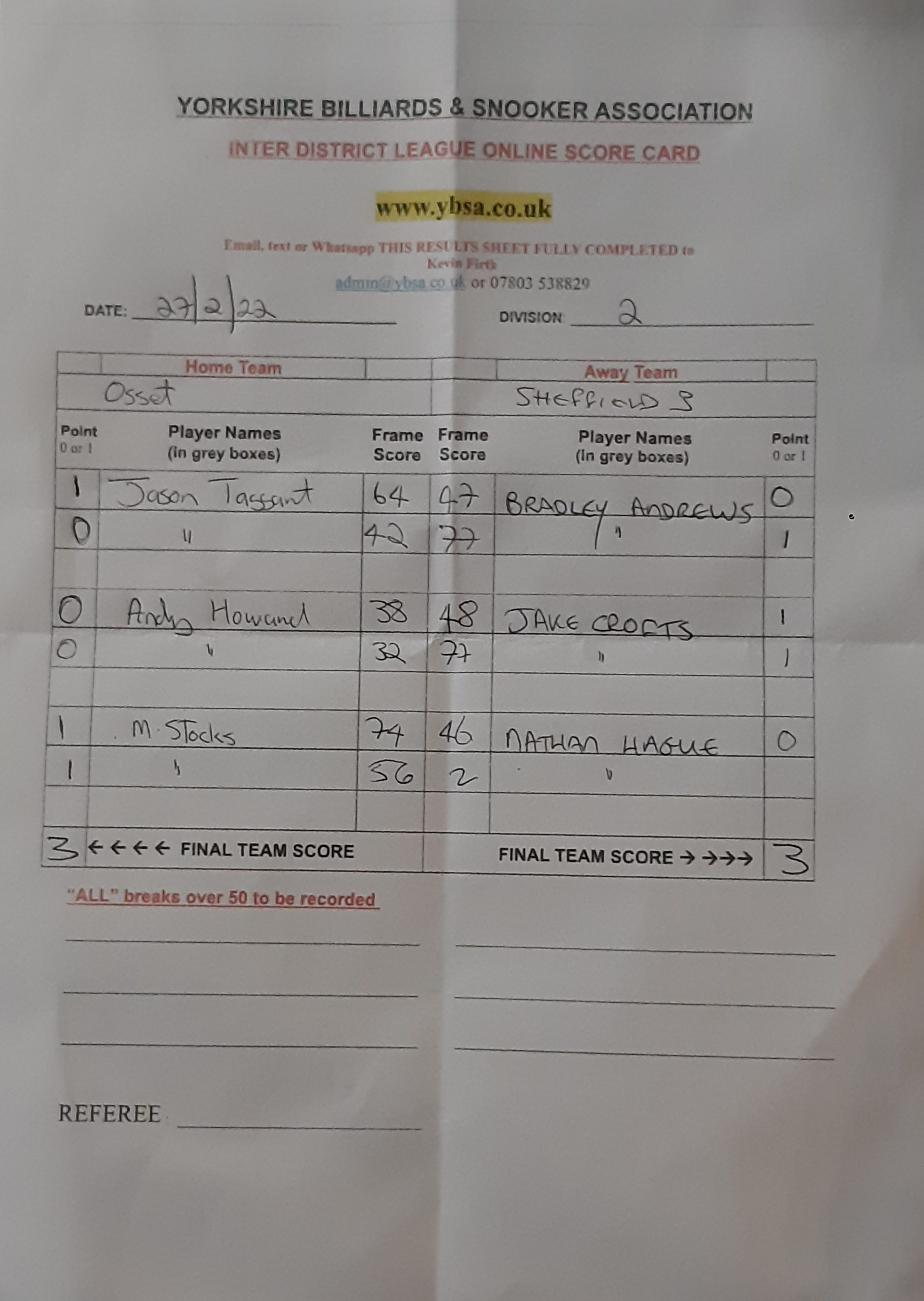 | 26th February 2022 | 7:30 pm | Division Two 2021/22 | 2021/22 | Fixture 3 |