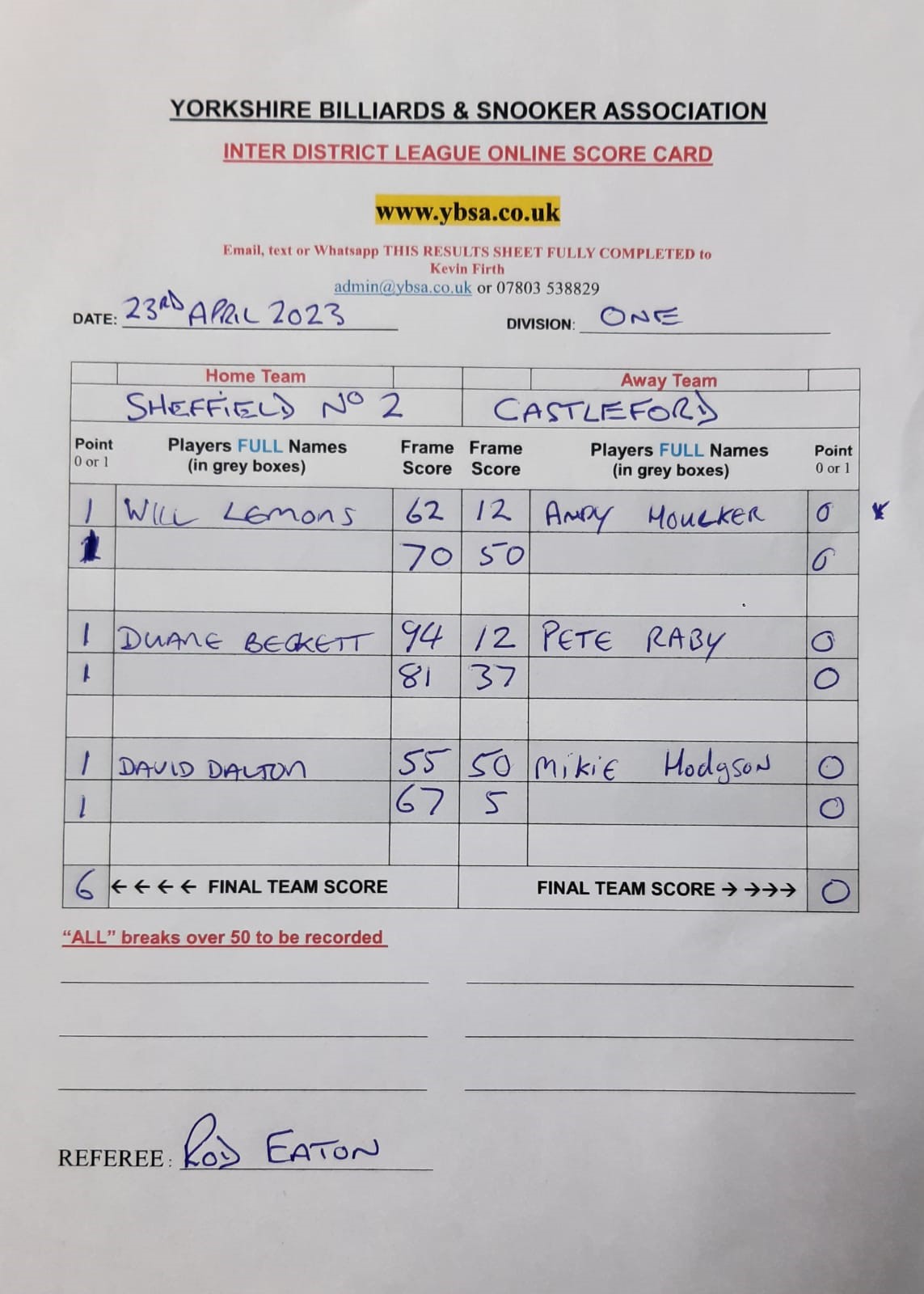 | 15th April 2023 | 7:30 pm | Division One 2022/23 | 2022/23 | Fixture 12 |