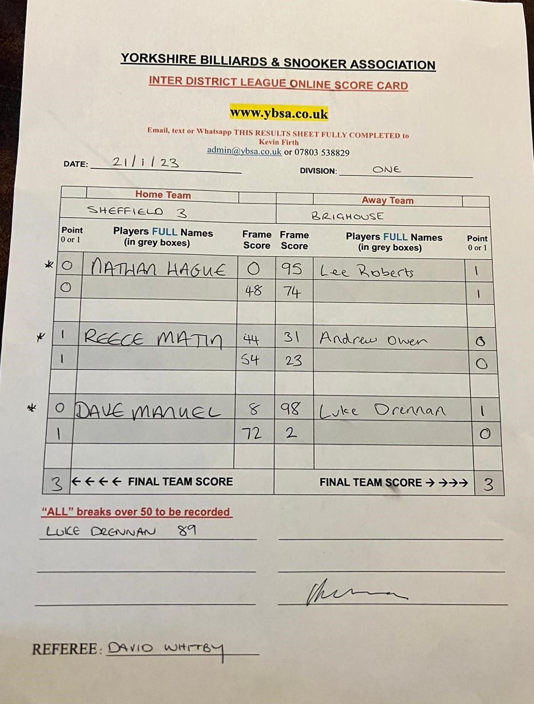 | Sheffield 3 | 3 | Draw |