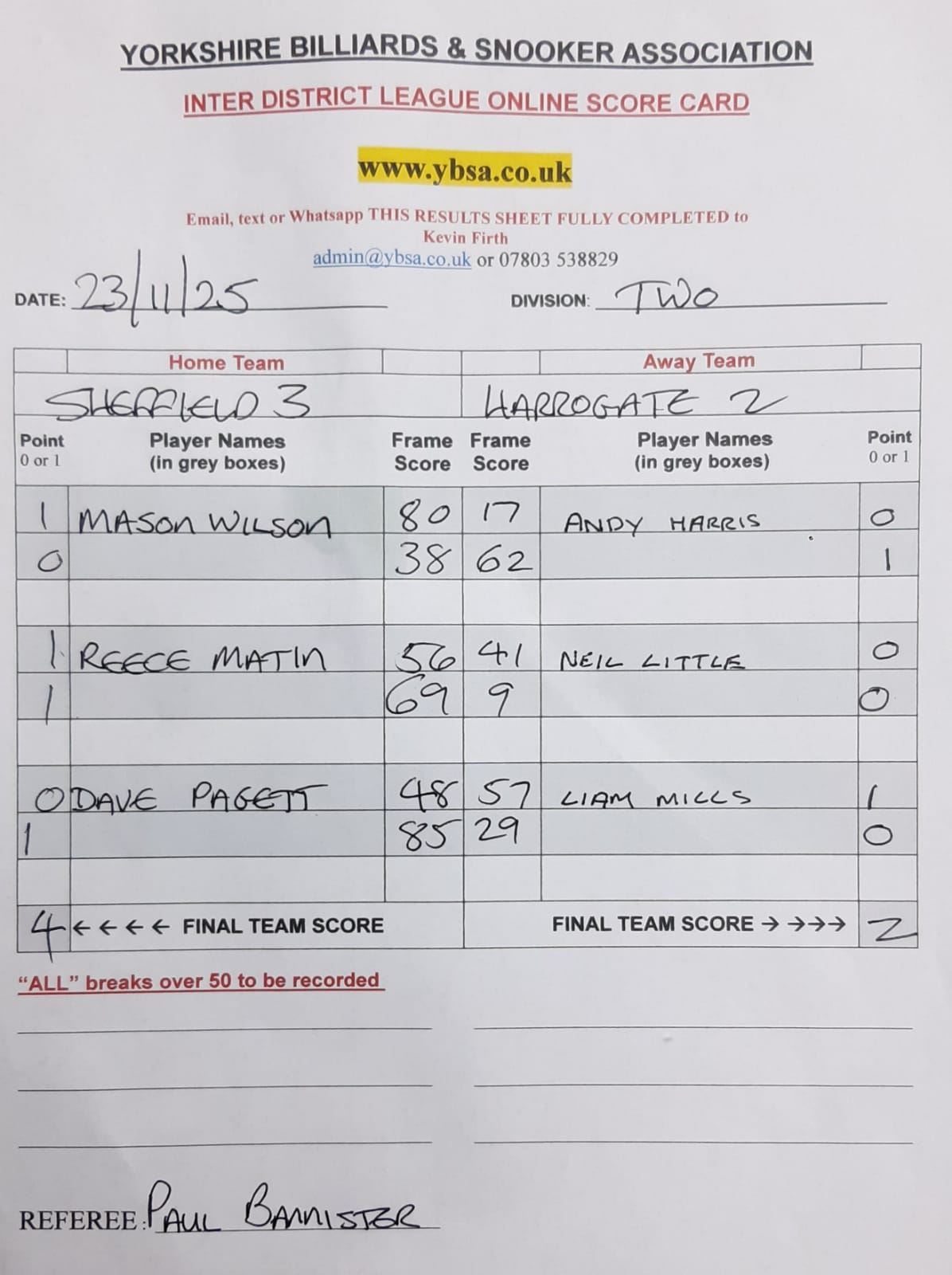 | 22nd November 2025 | 7:30 pm | Division Two 2025/26 | 2025/26 | Fixture 4 |