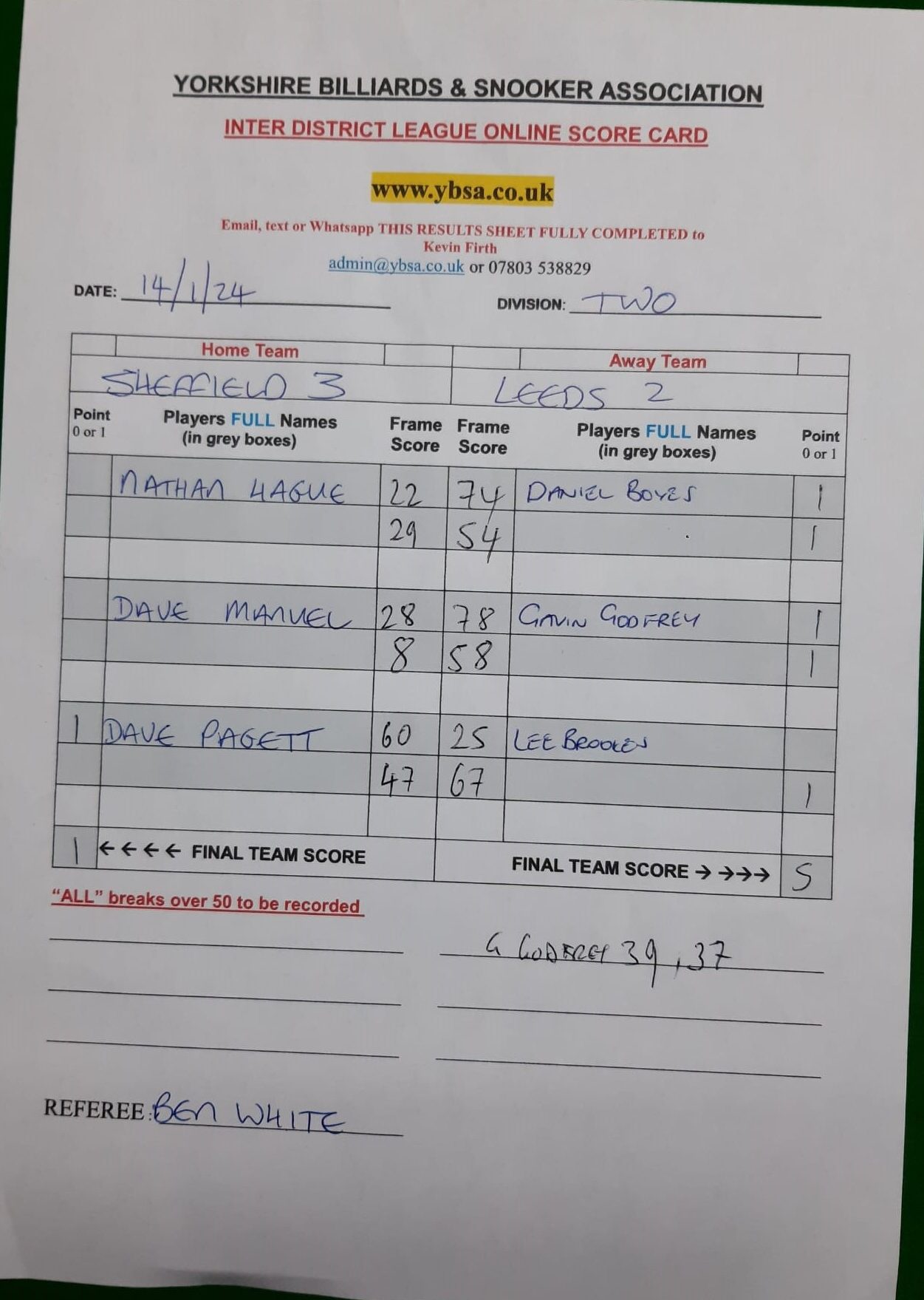 | 6th January 2024 | 7:30 pm | Division Two 2023-24 | 2023/24 | Fixture 4 |