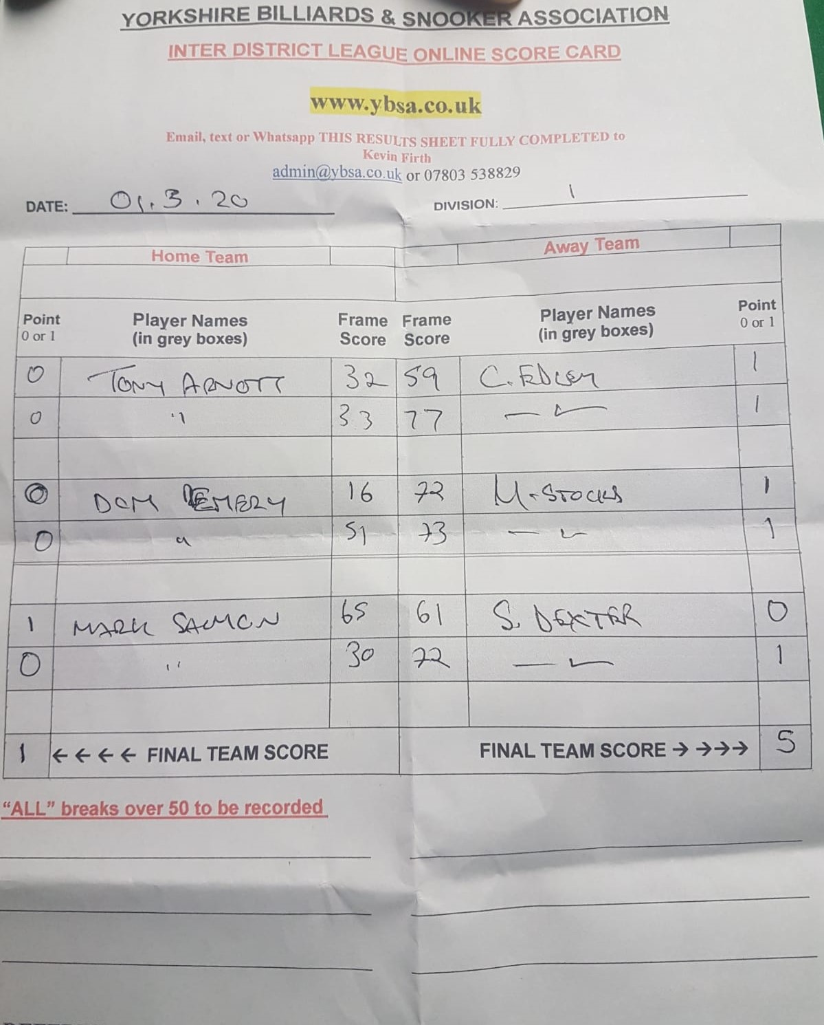 | 4th January 2020 | 7:30 pm | Division One 2019/20 | 2019/20 | Fixture 5 |