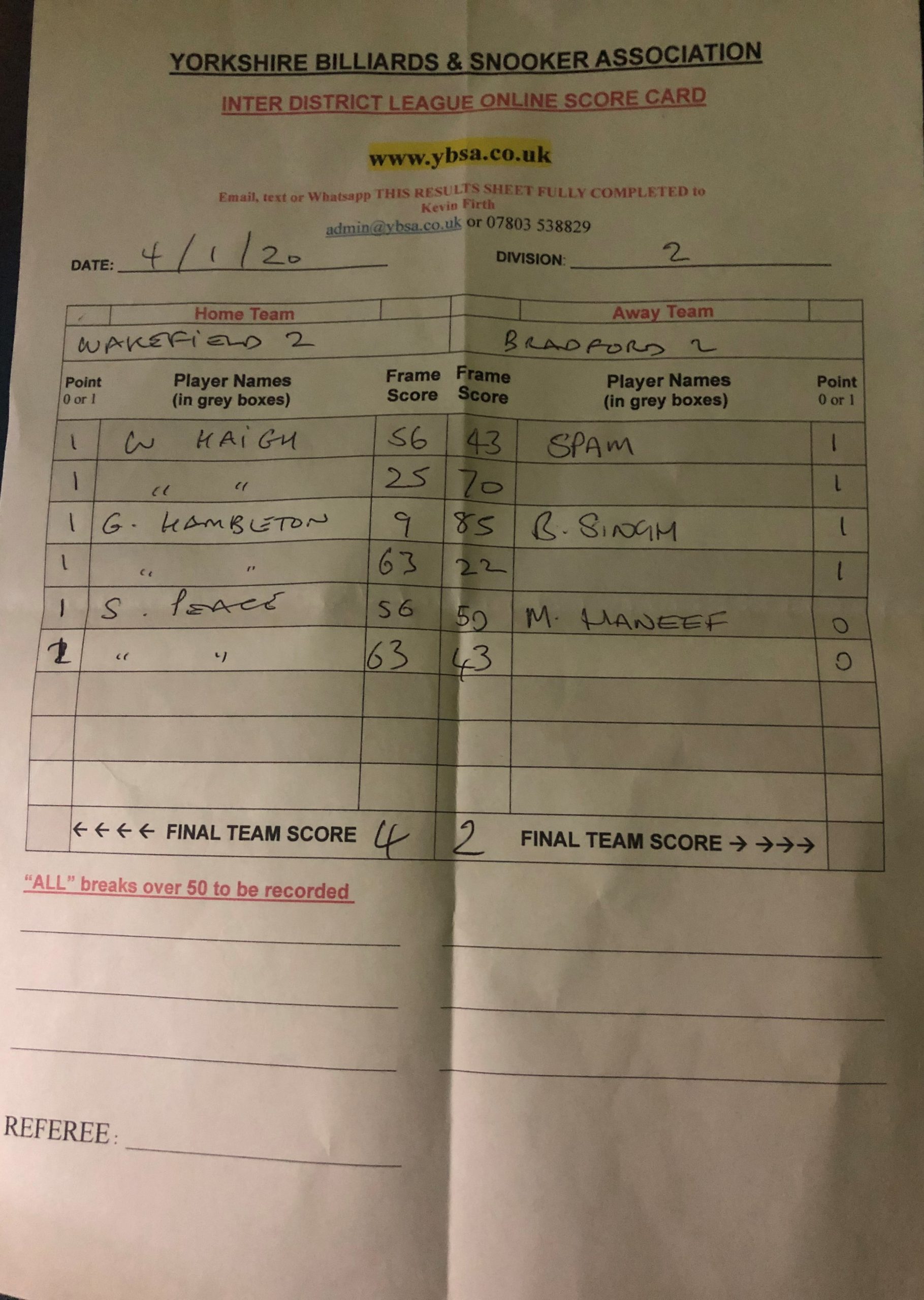 | 4th January 2020 | 7:30 pm | Division Two 2019/20 | 2019/20 | Fixture 5 |