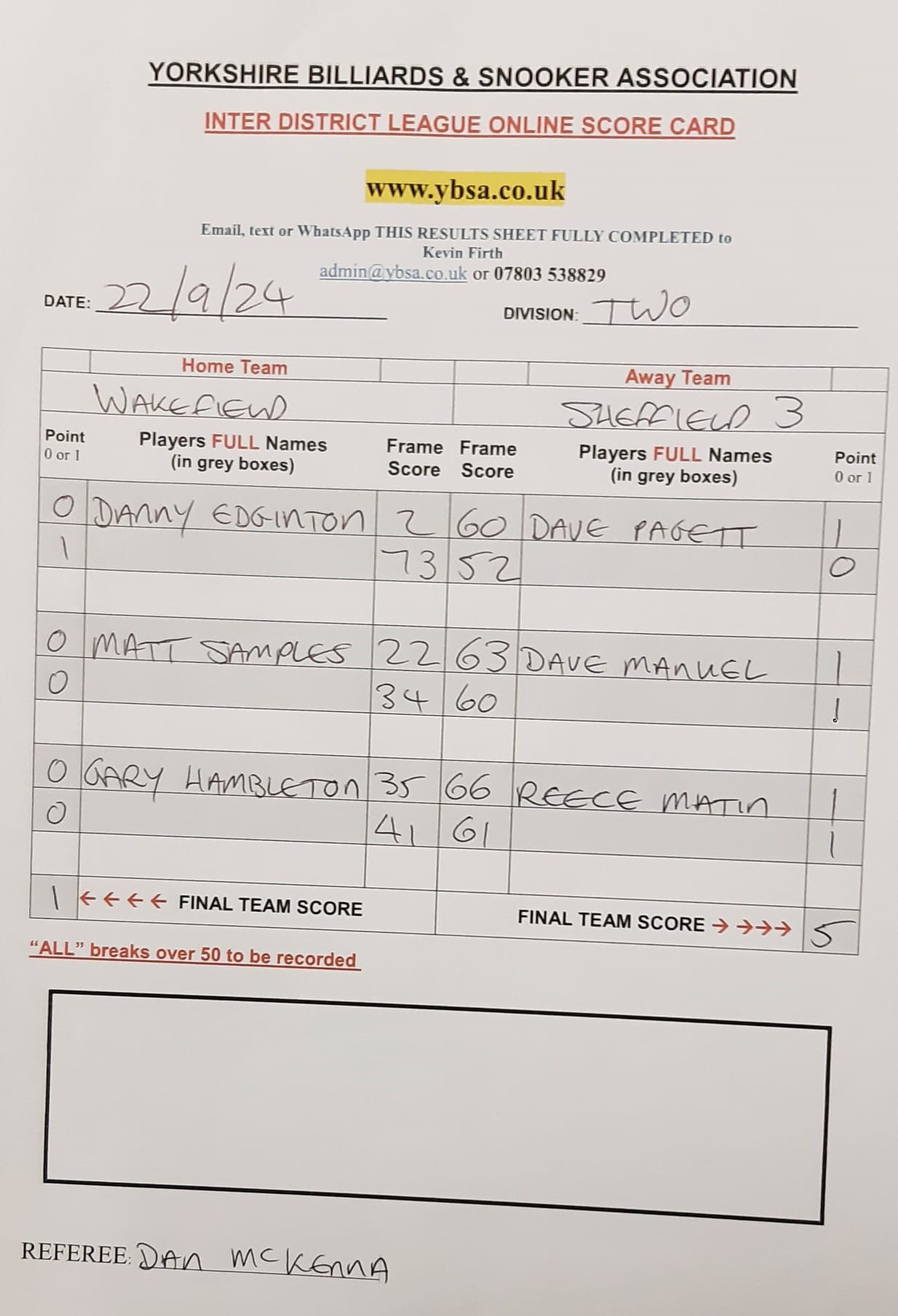 | Sheffield 3 | 5 | Win |