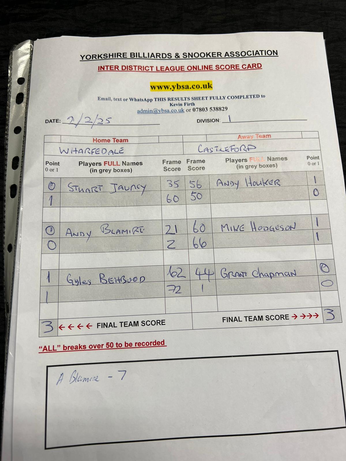 | 1st February 2025 | 7:30 pm | Division One 2024/25 | 2024/25 | Fixture 9 |