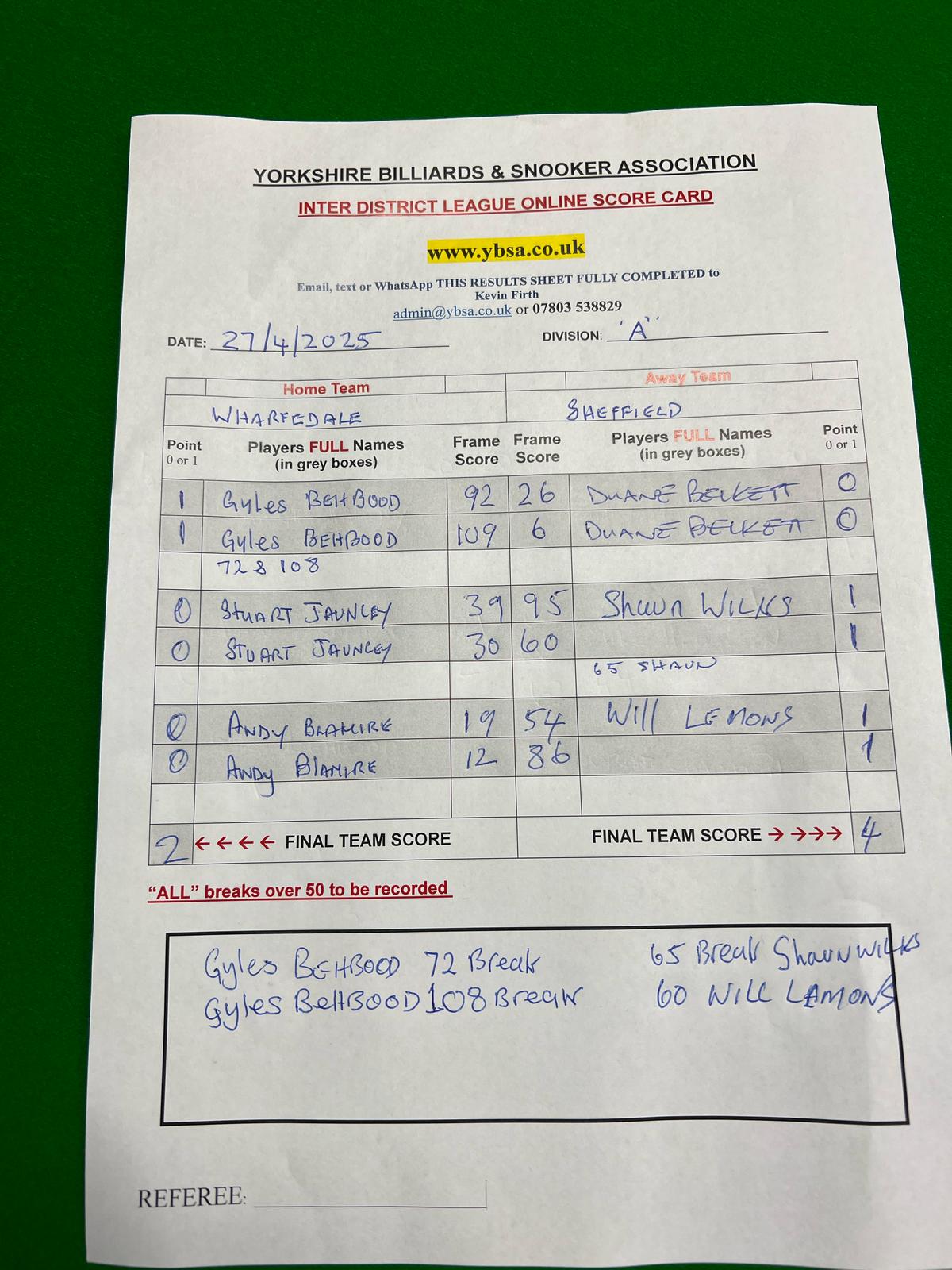 | Sheffield 2 | 4 - 2 | Wharfedale |