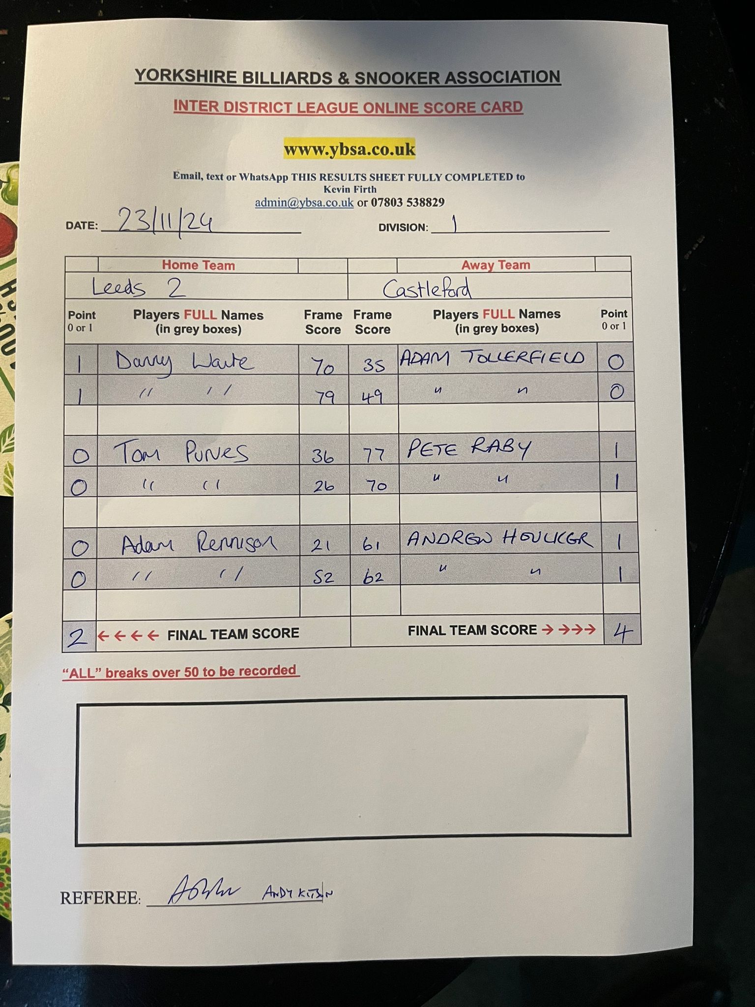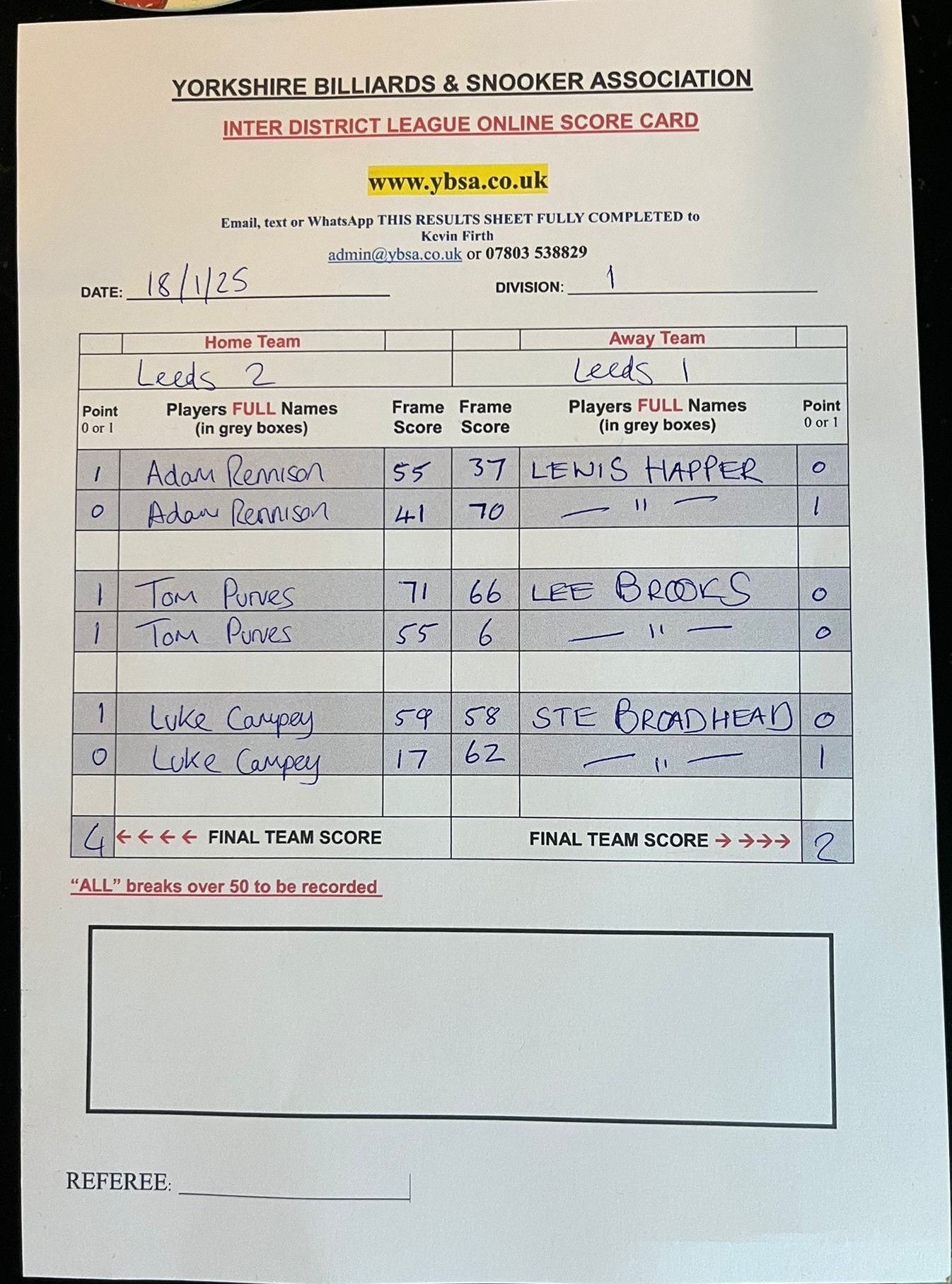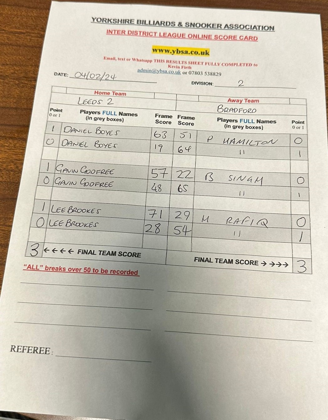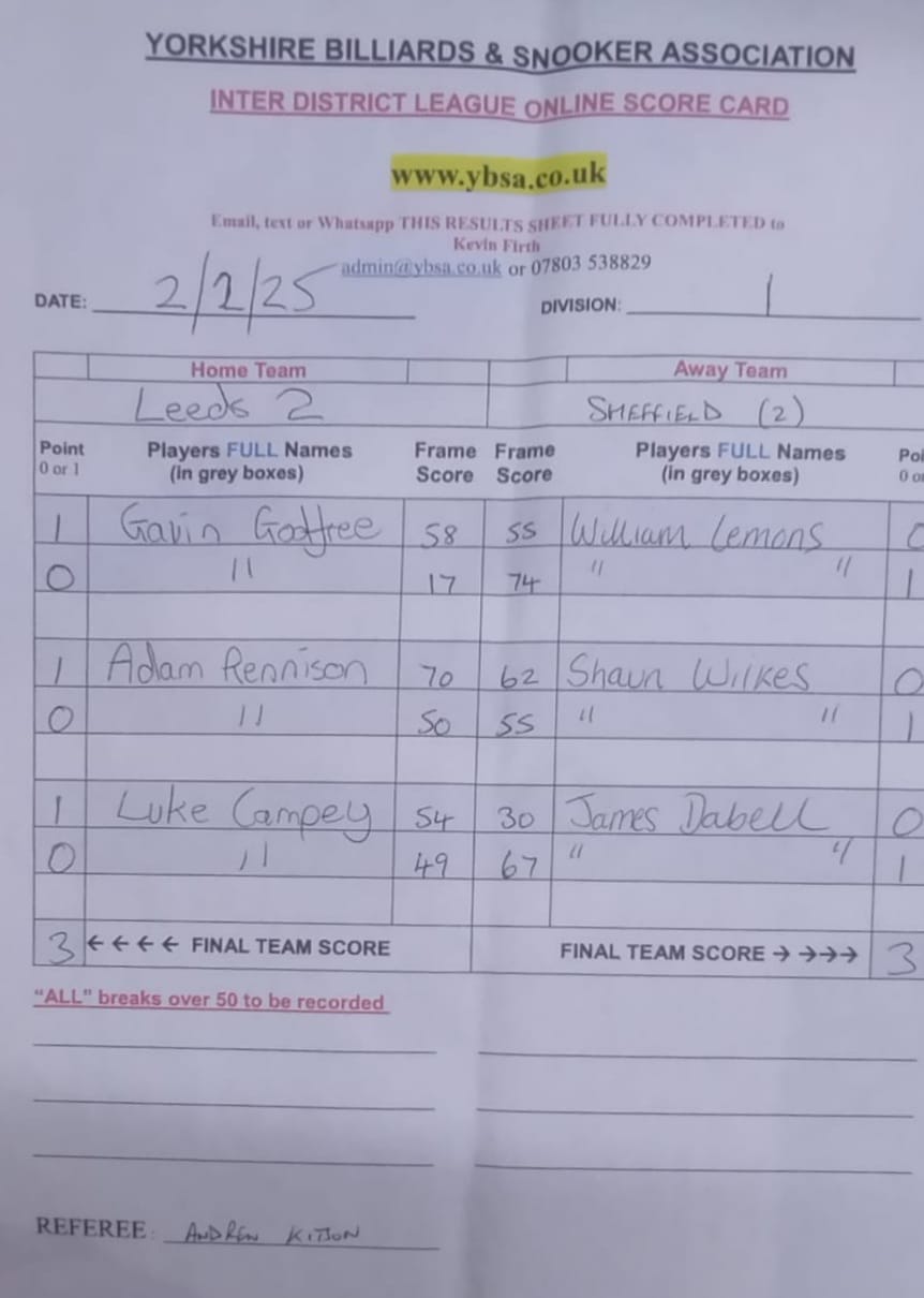 Leeds 2 vs Sheffield 3