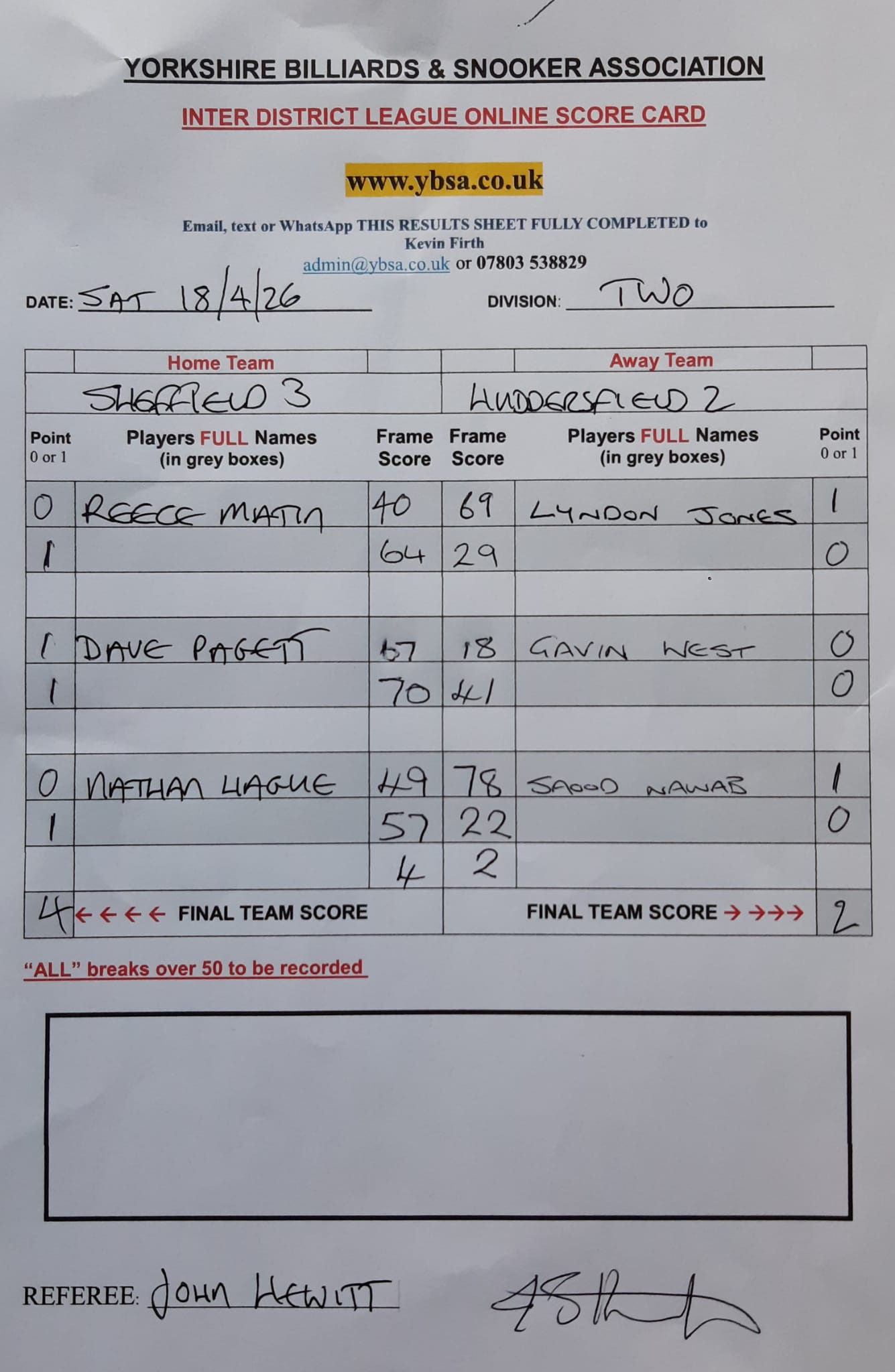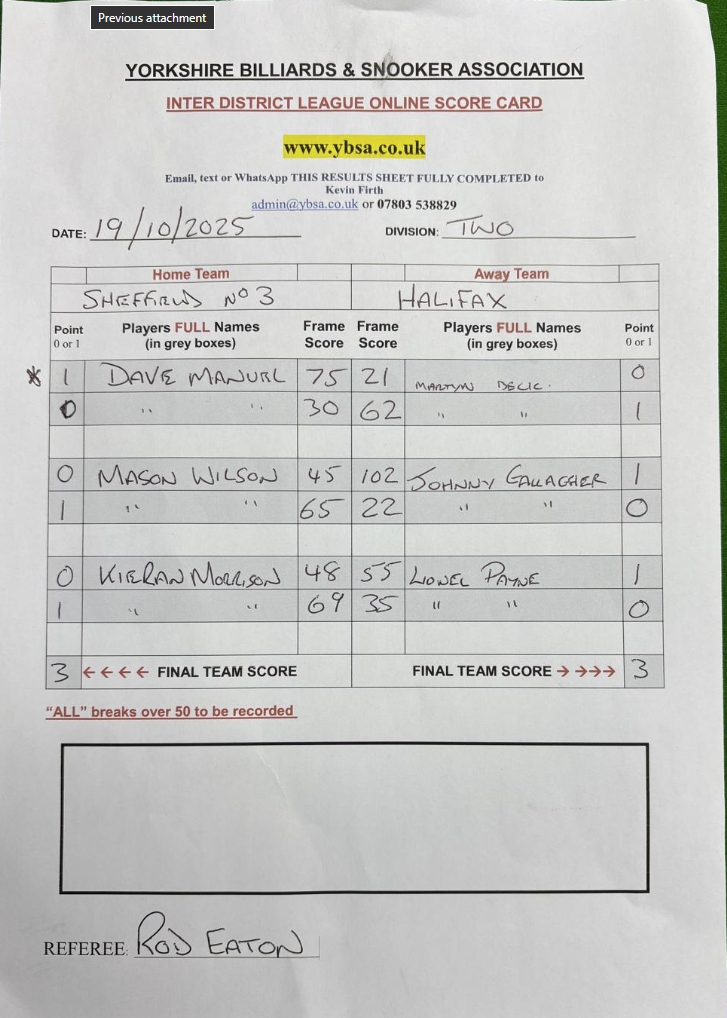 Sheffield 3 vs Bye 2